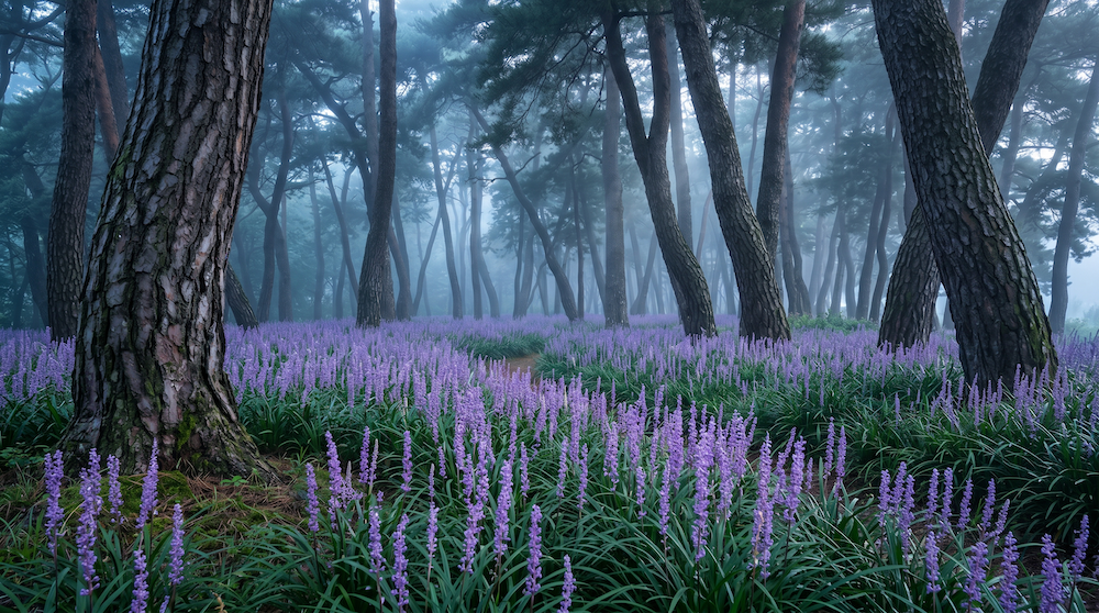 황성공원의 소나무 숲 아래 펼쳐진 맥문동 군락은 경주 여름의 정점입니다. 블로거는 이 장면을 선택하며 소나무의 거친 질감과 보라색 꽃의 부드러움이 만드는 '질감의 대조'에 집중했습니다. 프롬프트 과정에서는 새벽 안개가 빛을 산란시키는 틴들 현상을 세밀하게 묘사하여 몽환적인 분위기를 극대화했습니다. 결과물은 마치 신선이 살 것 같은 고요하고 정제된 동양적 미학을 완벽하게 담아냈습니다.